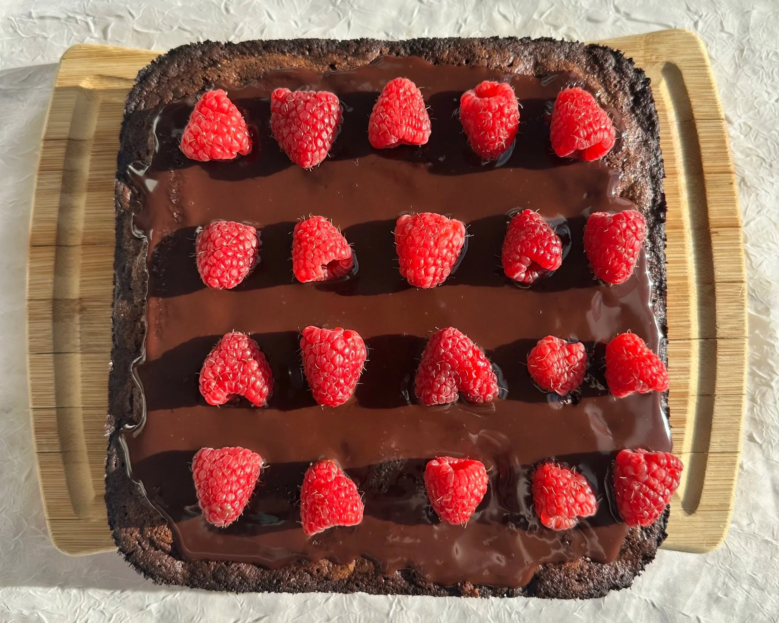 Once brownies are cooled, spread your ganache over the top and top with your raspberries.